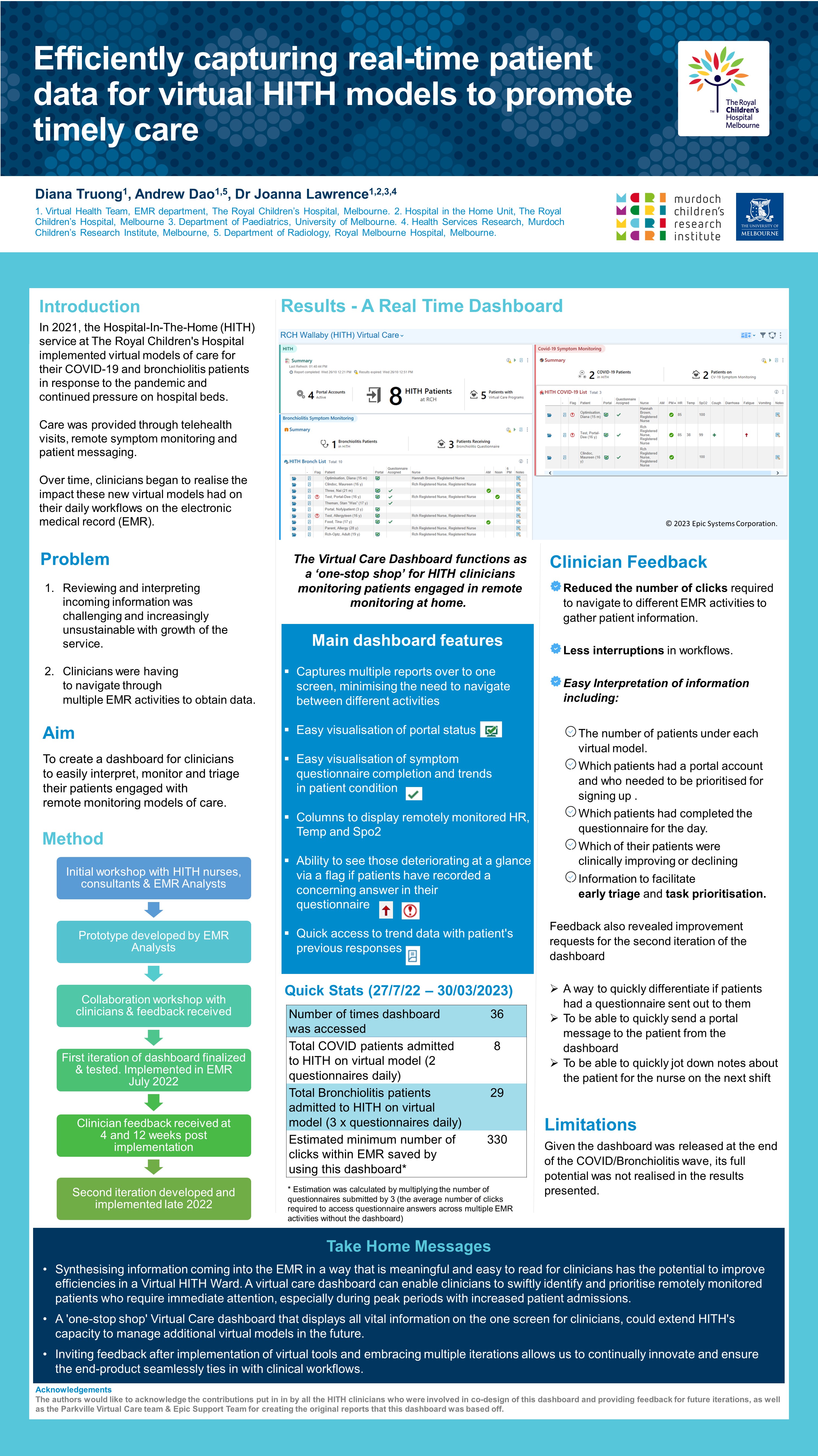 Diana Truong is the Senior Analyst on the Virtual Care Team at The Royal Children's Hospital. She is a Physiotherapist by background and has worked in digital health for 4 years. Diana is passionate in ensuring that health equity remains at the forefront of design and implementation as digital health develops.
